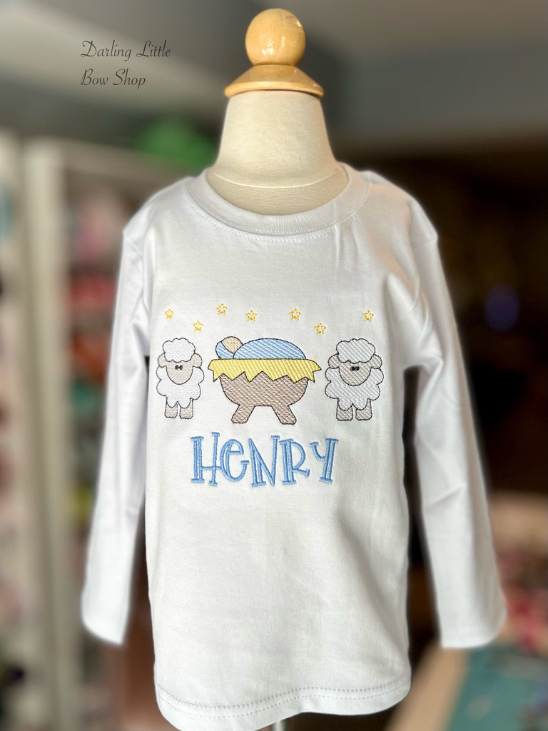 This Christ the newborn King bodysuit or shirt for boys is embroidered with a design featuring baby Jesus, sheep, and stars. Personalize it with your child's name in blue. Matching sister set available. Celebrate the birth of Jesus with this unique and meaningful shirt.