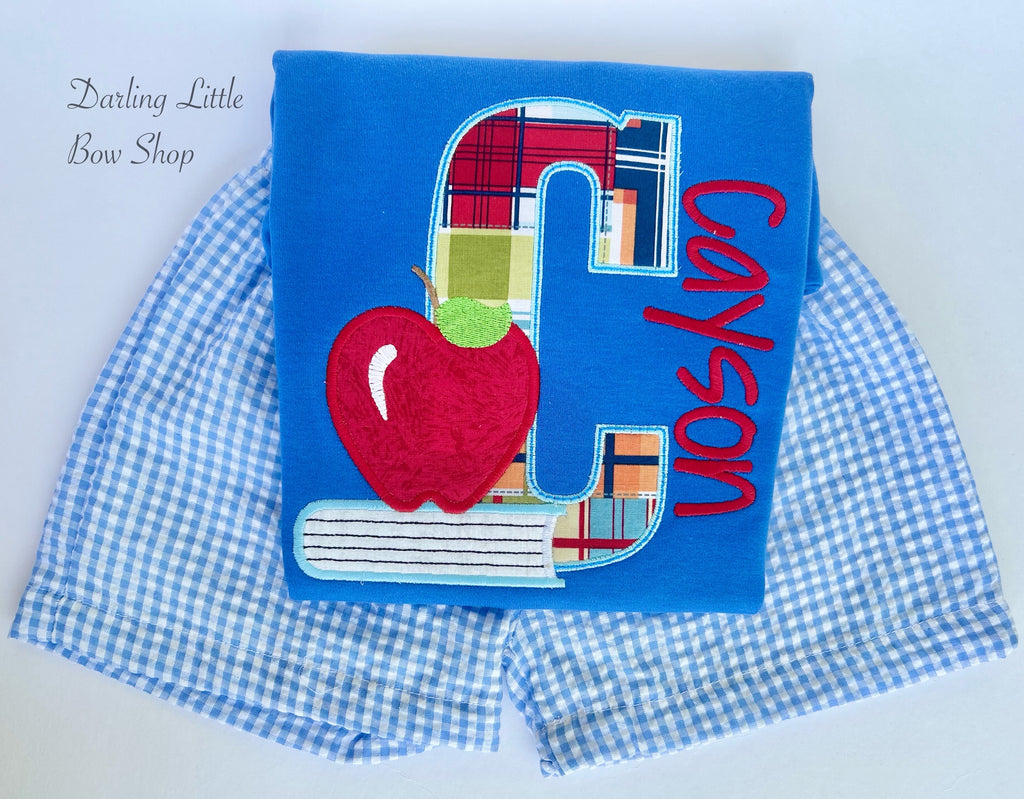 Featuring a delightful sewn appliqué with a plaid initial, a sweet book and apple design, and a personalized name in bright red, it adds a touch of boutique charm to their school day outfit.