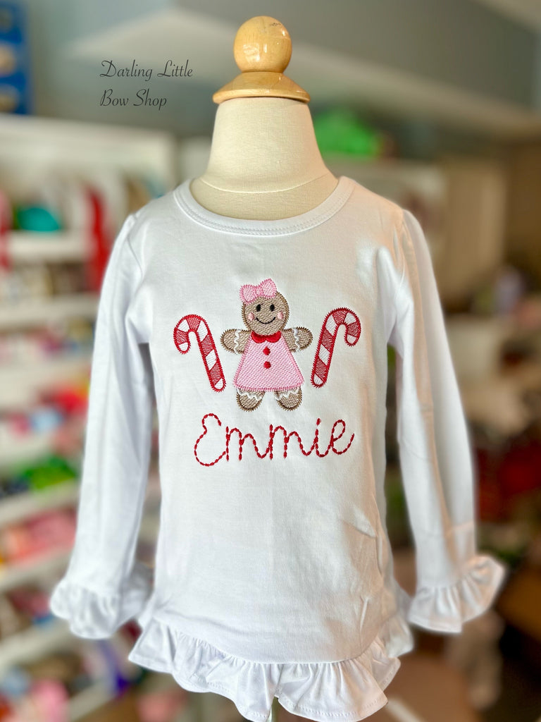 This Gingerbread Lane shirt for girls features a festive gingerbread and candy cane design, personalized with your daughter's name. Made from high-quality materials, this shirt is the perfect addition to any holiday wardrobe. Spread holiday cheer with this fun and unique shirt.