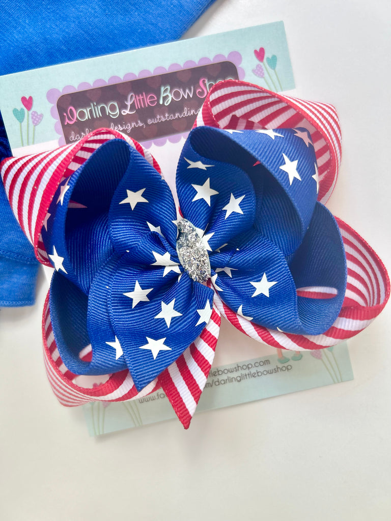 This sweet patriotic bow is made with red, white and blue ribbons with a silver center. The bow is double stacked and measures about 5" wide.