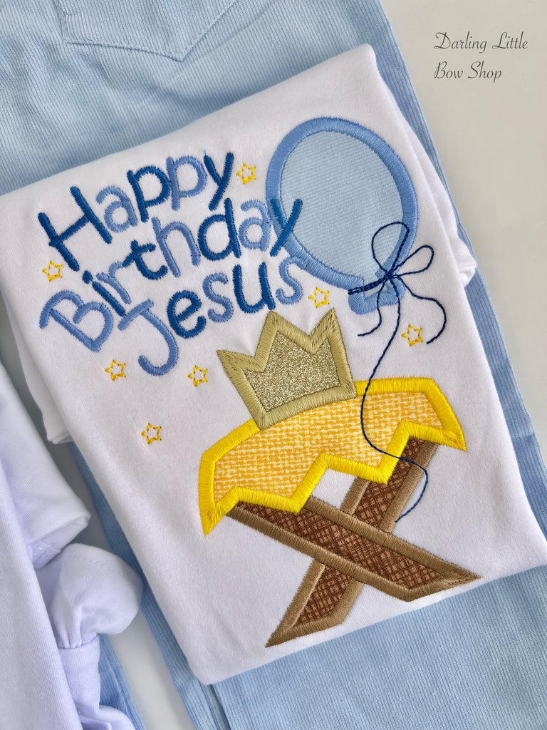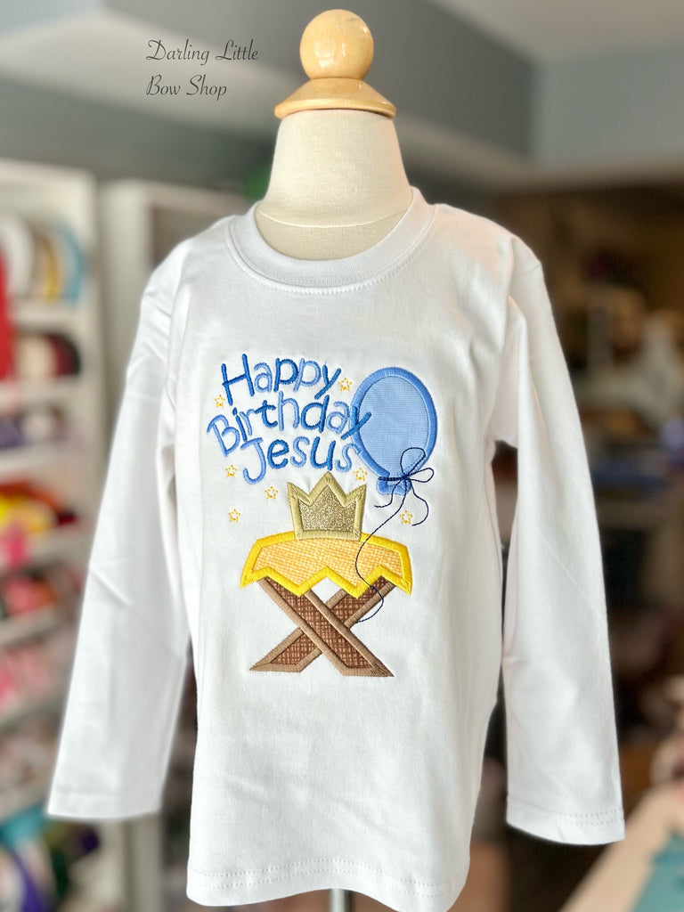 The Happy Birthday Jesus bodysuit or shirt for boys is embroidered with a design featuring manger, crown, and balloon. Matching sister set available. Celebrate the birth of Jesus with this unique and meaningful shirt.