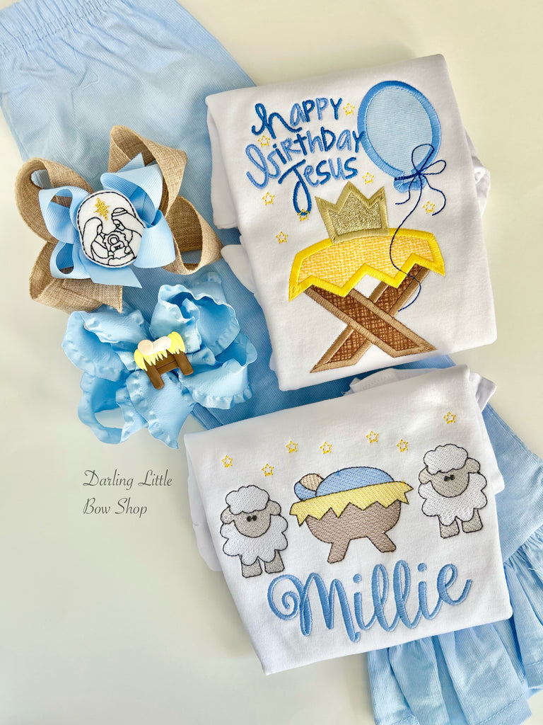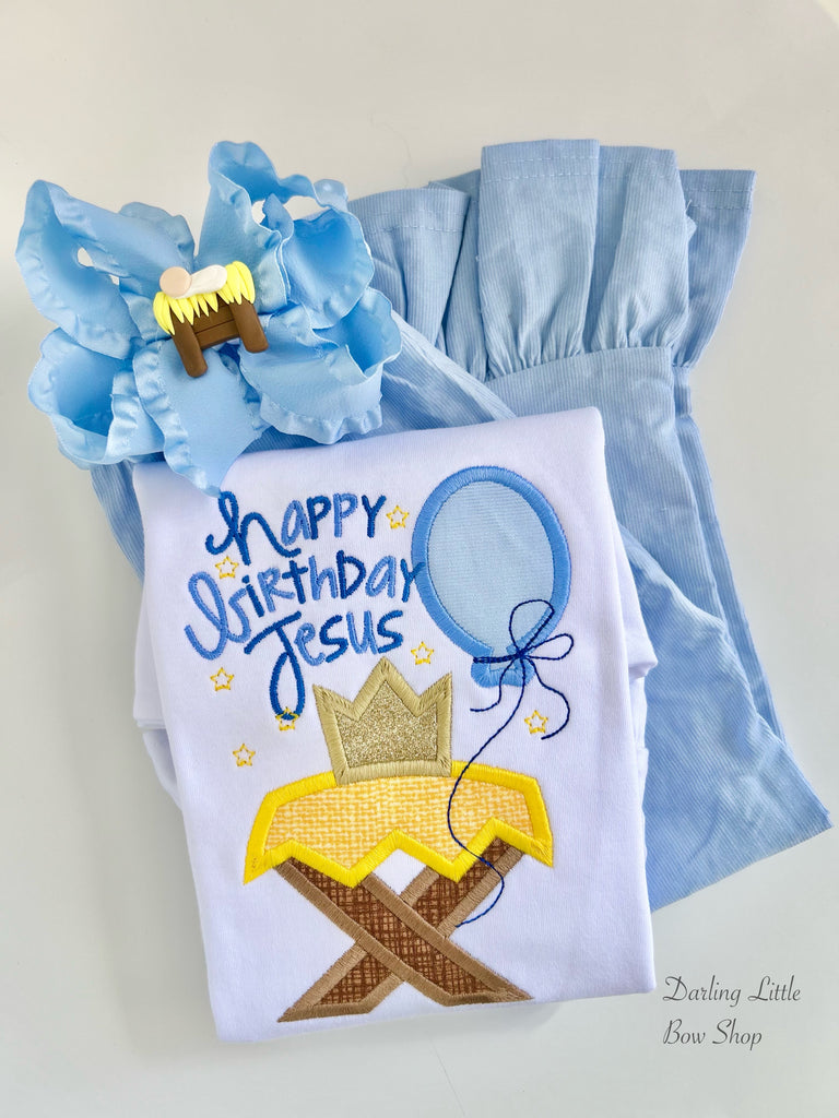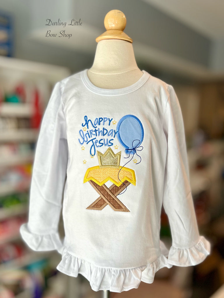 Celebrate the birth of Jesus with this Christ, with our Happy Birthday Jesus shirt for girls. With a manger, crown annd balloon embroidered on the front, this shirt a perfect reminder of the true meaning of Christmas.