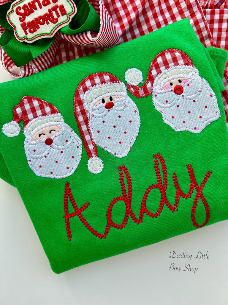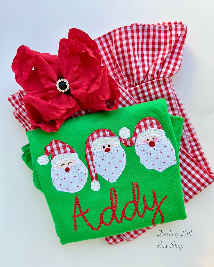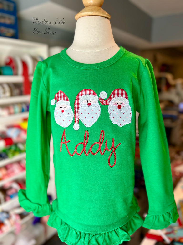 Our Jolly Santa shirt for girls is the perfect addition to any holiday wardrobe. Made with a soft, green ruffle shirt and featuring an appliqué design of three festive Santas, complete with matching red gingham hats. Personalize it with a name in a beautiful cursive font. Spread holiday cheer with this adorable and unique shirt.