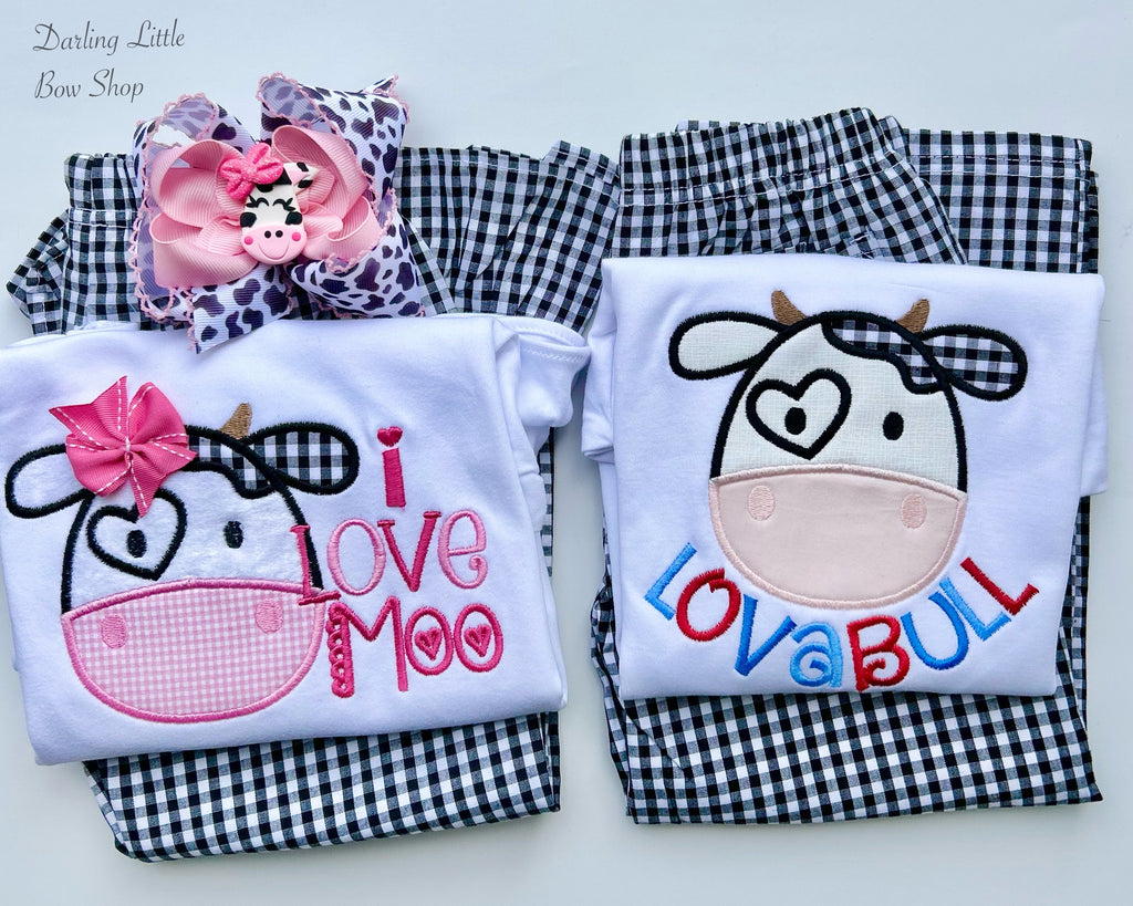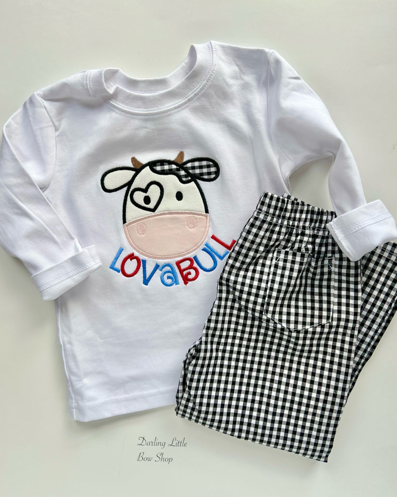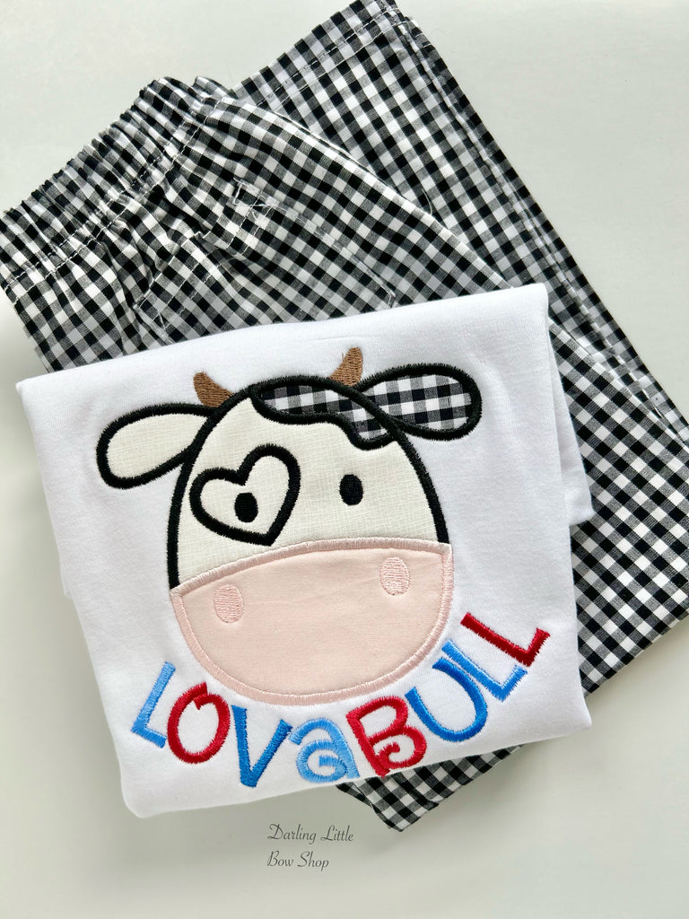 Cow theme Valentine “Lovabull” shirt or bodysuit for boys. This top is custom made and adorable cow and sewn with blues and red.
