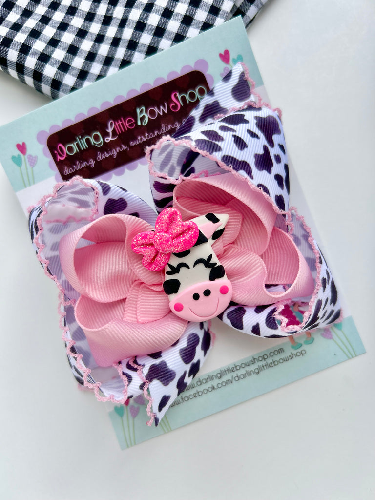 A 5” hairbow made with pink and our exclusive lacy edge cow print ribbon, with a clay cow face center.