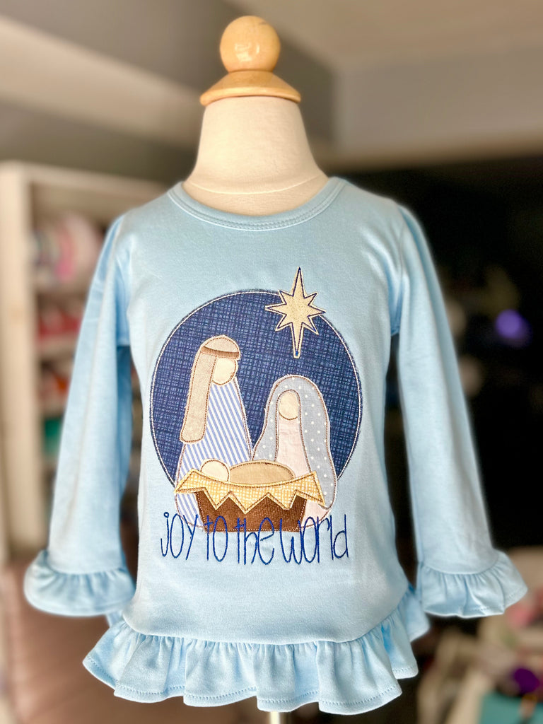 Nativity light blue ruffle shirt for girls - Joy to the World