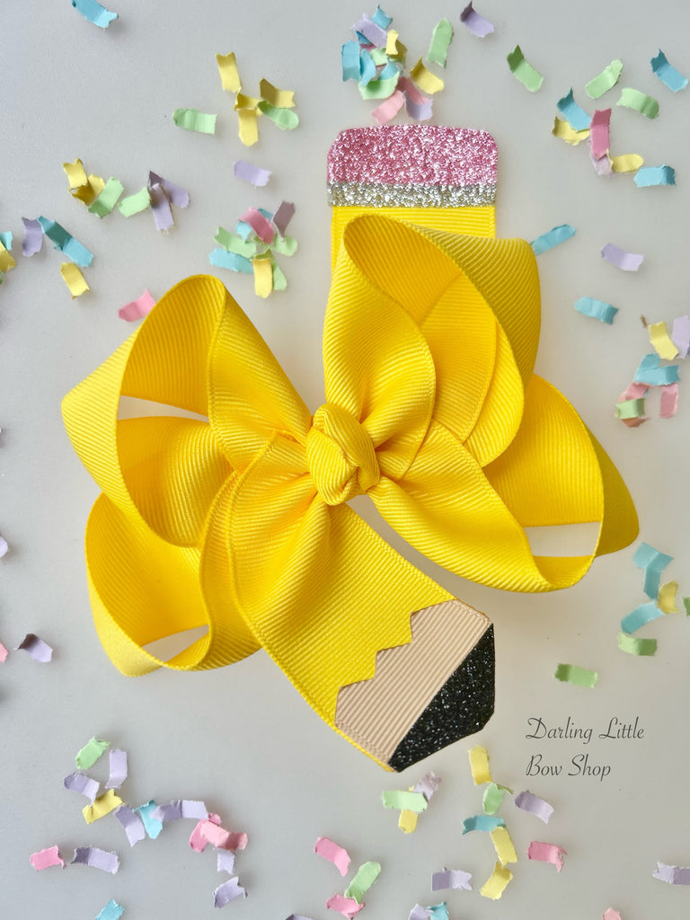 Pencil hairbow for girls. These sweet bows are made with yellow ribbon, and decorated with pink, silver and black glitter vinyl.