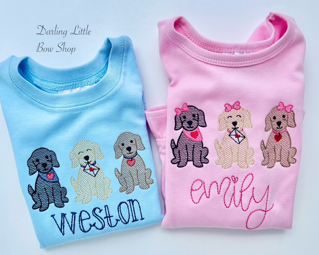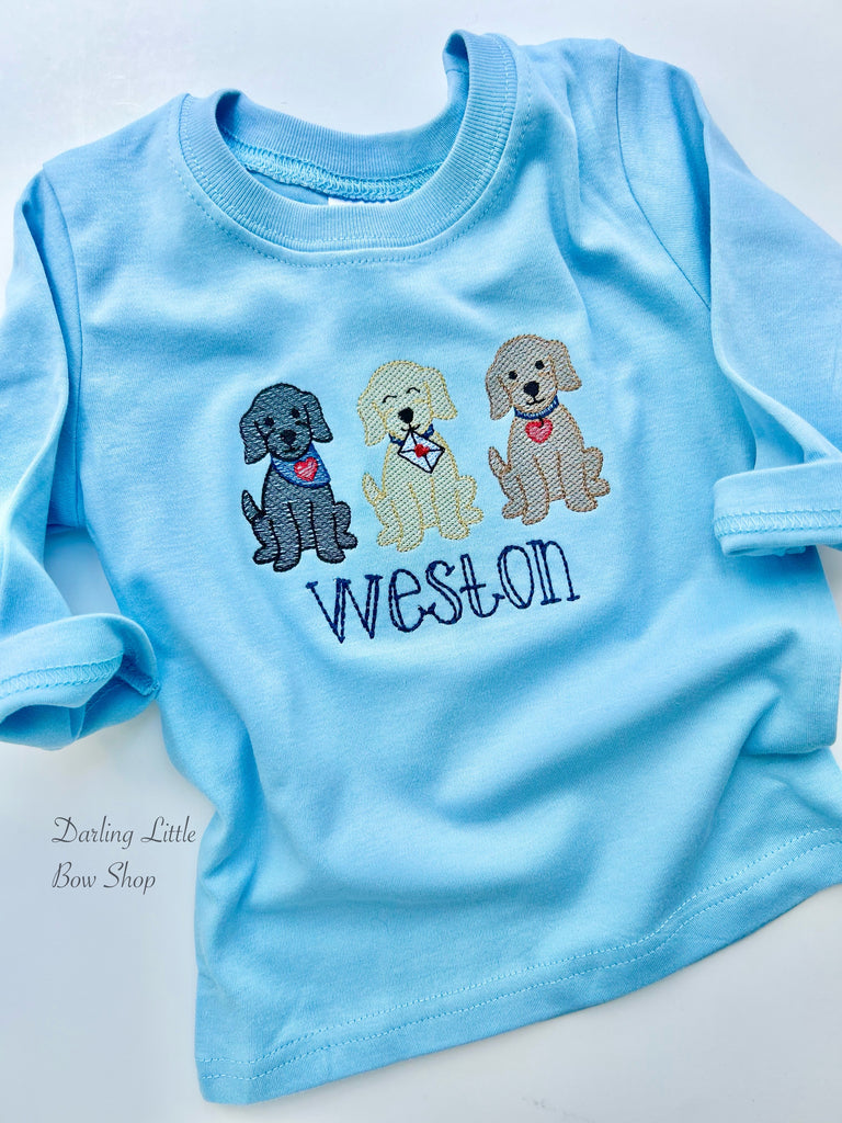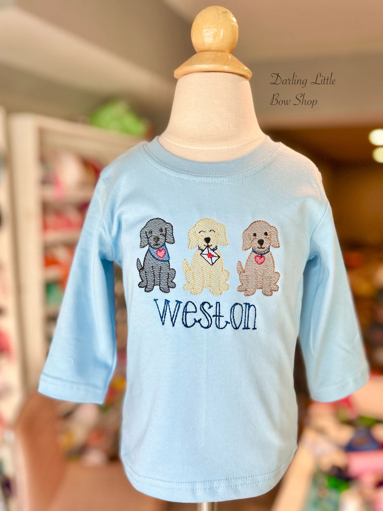 Valentine puppy shirt for boys with a trio of adorable dogs. Introduce your little one to the magic of Valentine's Day with our Puppy Love Valentine Blue Shirt for boys. Made with a soft, comfortable fabric and featuring three adorable embroidered puppies, this shirt is perfect for spreading love. Personalize it with your child's name in navy for a special touch.