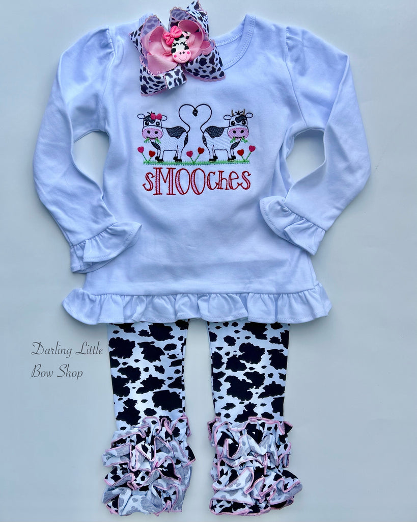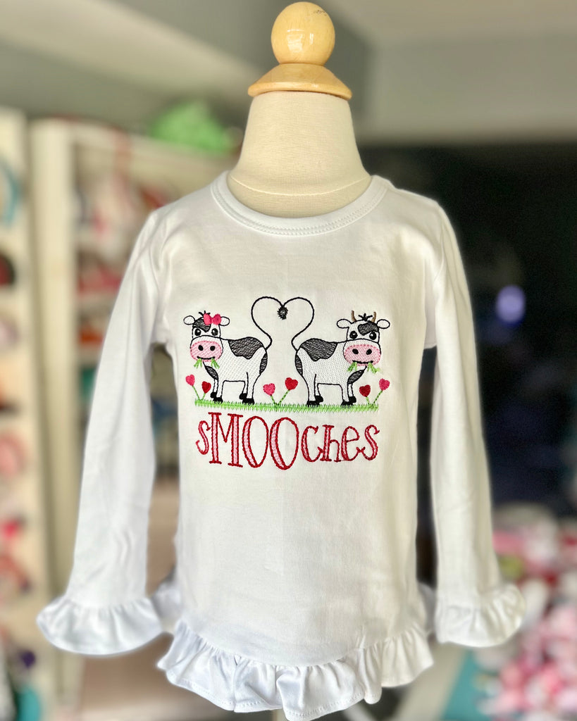 Cow theme “sMOOches” bodysuit or shirt for girls.