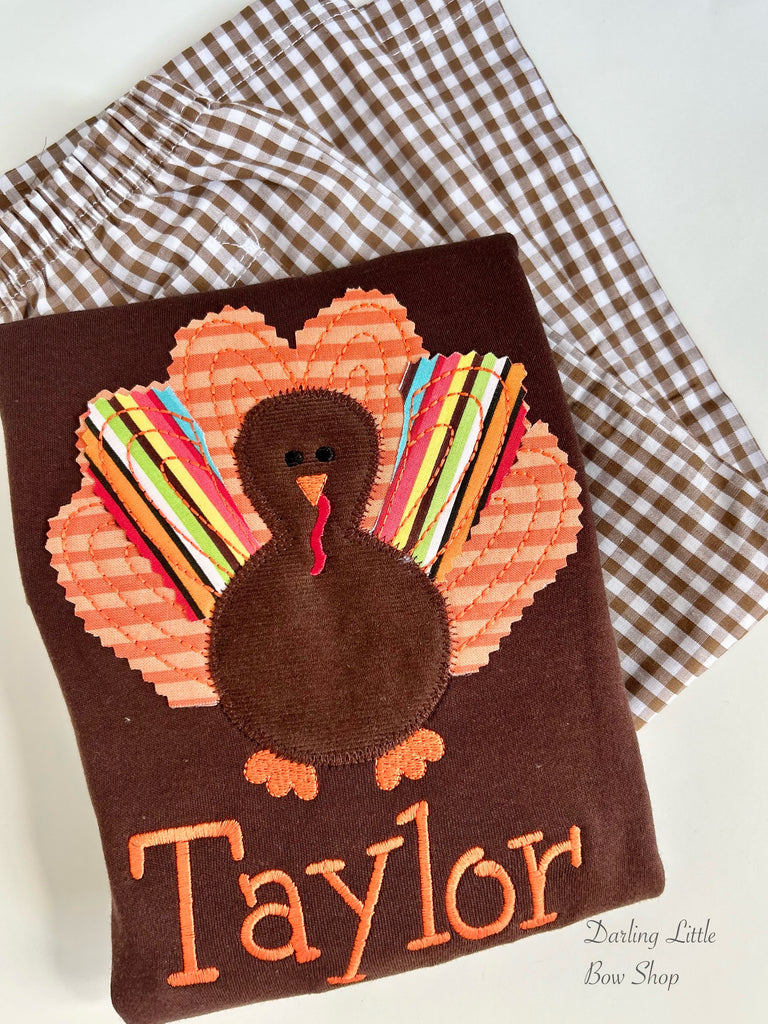 Thanksgiving shirt for little boys, brown shirt or bodysuit personalized with his name. Corduroy turkey with feathers of chevron and stripes!