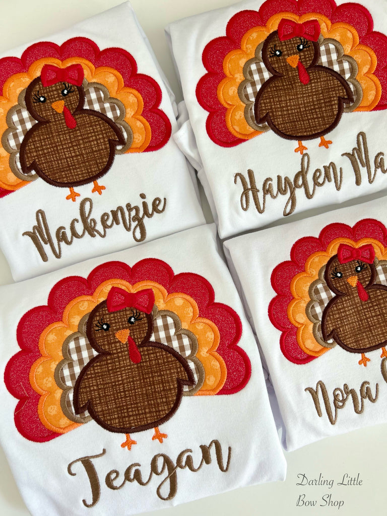 ::Traditional Turkey bodysuit or shirt for girls for Autumn and Thanksgiving. This sweet Turkey is sewn with red, orange and brown fabrics and wears a red bow. The shirt coordinates beautifully with our brown gingham ruffle pants.