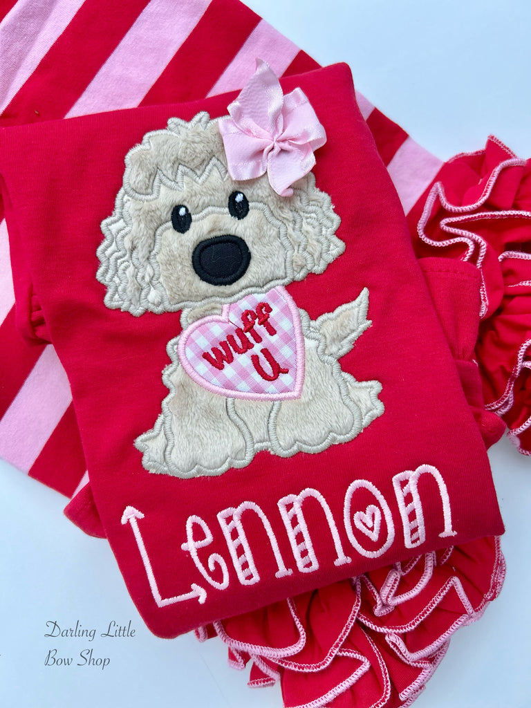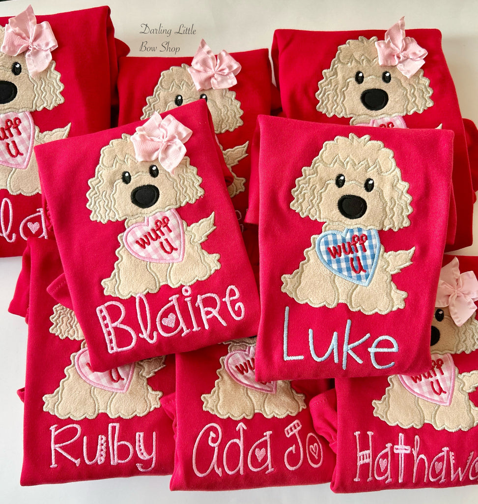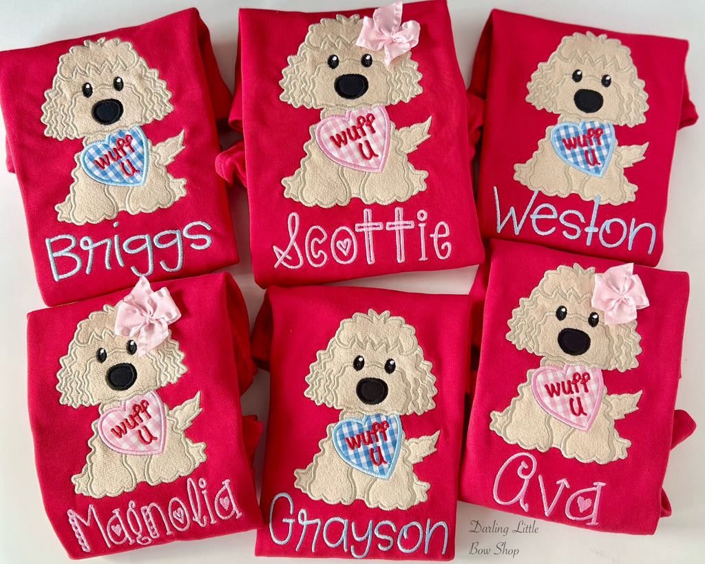 A red shirt with adorable, soft puppy holding an heart and personalized with name.