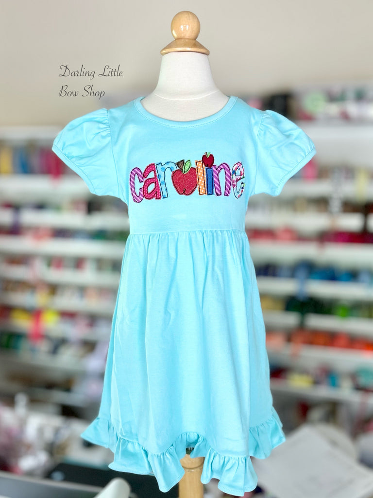 Aqua dress with the cutest school supplies applique name. The dress is made with her name sewn in colorful fabrics with school supplies such as pencil, apple, crayon, and ruler as some of the letters.