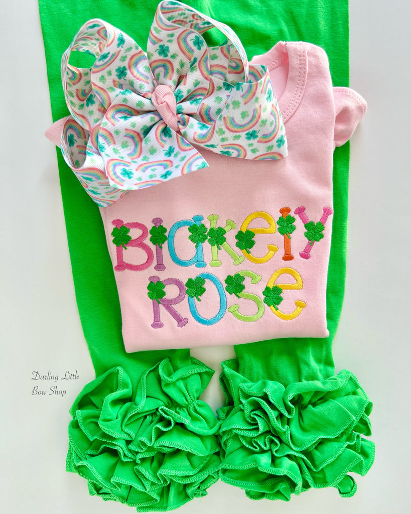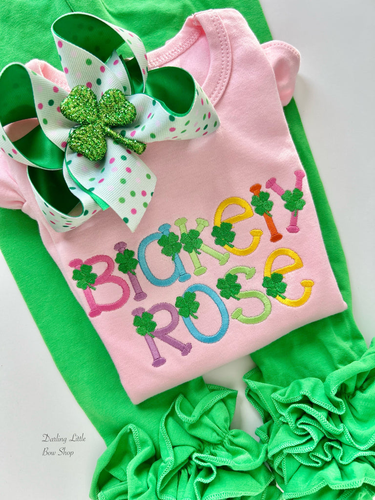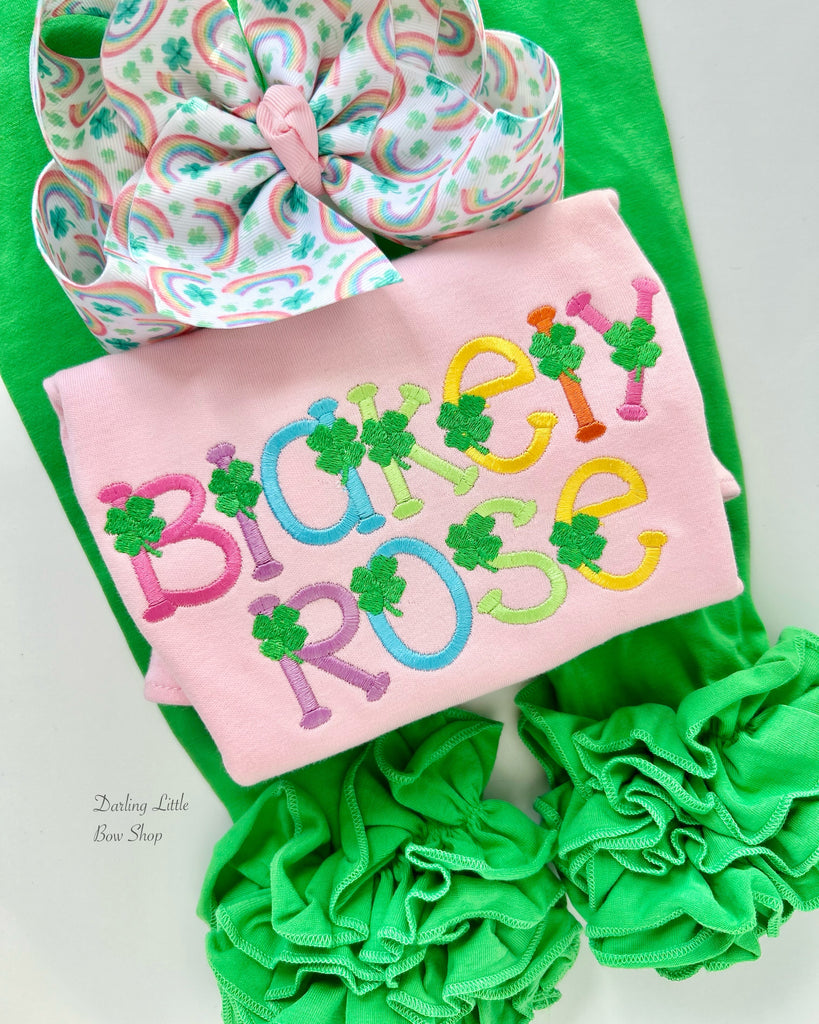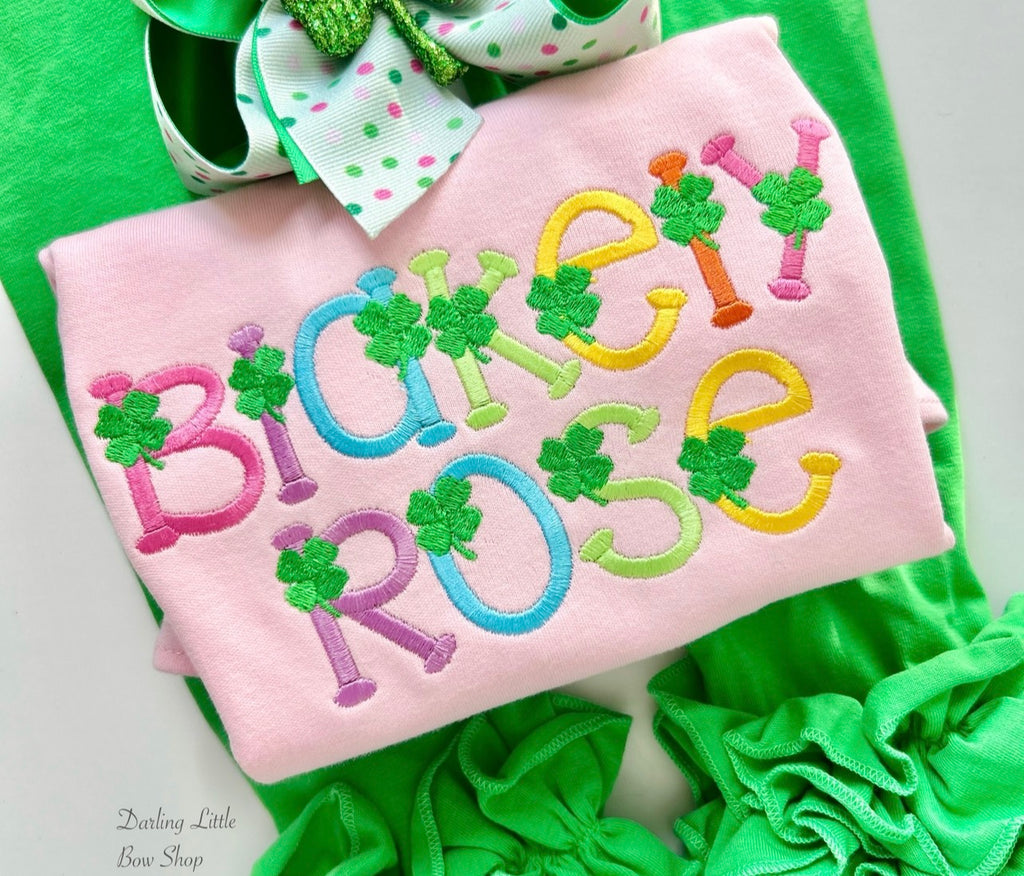Girls shirt for St. Patrick's day. Our Happy Go Lucky design is bright and cheerful, with her name embroidered in bright color shamrock font, on a pink ruffle shirt.