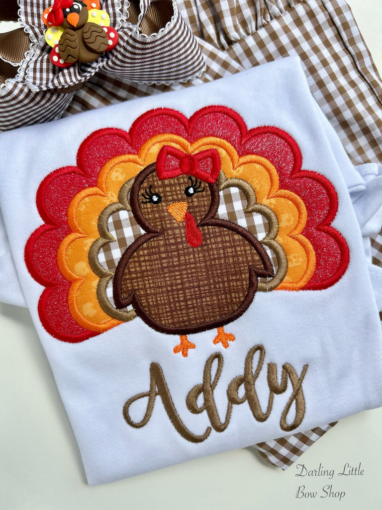 ::Traditional Turkey bodysuit or shirt for girls for Autumn and Thanksgiving. This sweet Turkey is sewn with red, orange and brown fabrics and wears a red bow.  The shirt coordinates beautifully with our brown gingham ruffle pants.